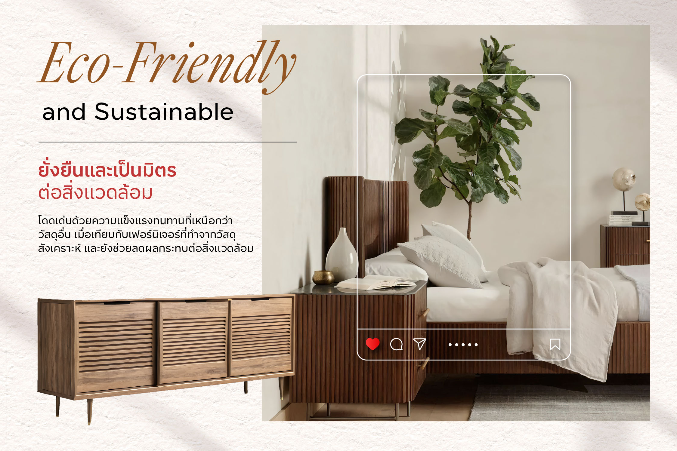 โดดเด่นด้วยความแข็งแรงทนทานที่เหนือกว่าวัสดุอื่น เมื่อเทียบกับเฟอร์นิเจอร์ที่ทำจากวัสดุสังเคราะห์และยังช่วยลดผลกระทบต่อสิ่งแวดล้อม โดยเฉพาะไม้เนื้อแข็งอย่างไม้สัก ไม้มะค่า หรือไม้แดง ที่มีความทนทานสูง ต้านทานปลวกและแมลงได้ดี ทำให้เป็นการลงทุนที่คุ้มค่าใช้งานกันไปได้ยาว ๆ